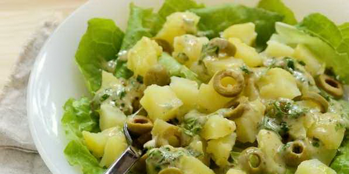 Інгредієнти: картопля -1 кг, оливки – 1 банка, петрушка – 1 пучок, листя салату, часник – 1 зубець, гірчиця -1 ст. л., винний оцет – 2 ст. л., олія нерафінована, сіль, мелений перець за смаком.